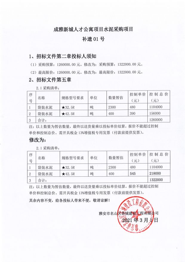 成雅新城人才公寓項(xiàng)目水泥采購(gòu)項(xiàng)目補(bǔ)遺01號(hào)